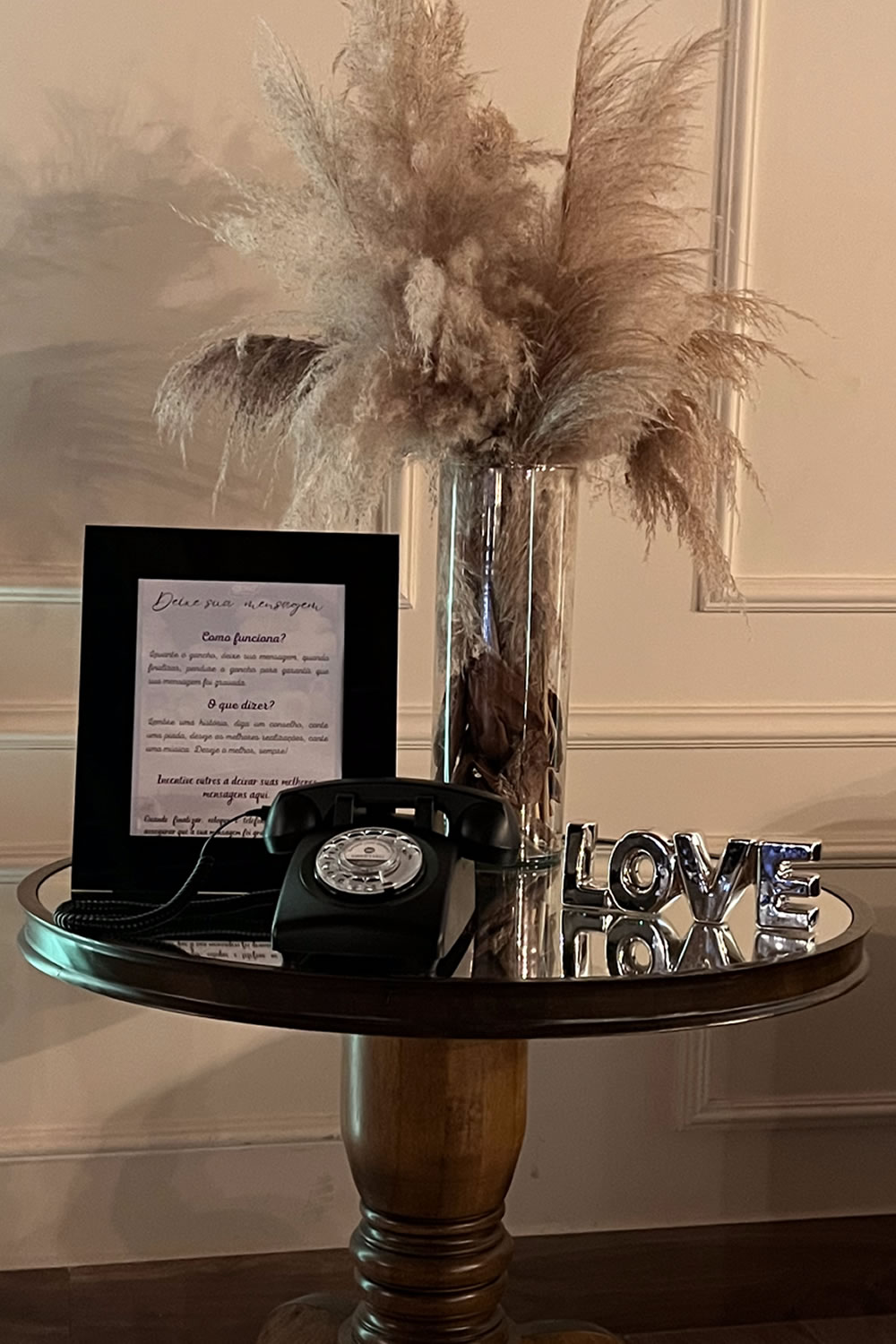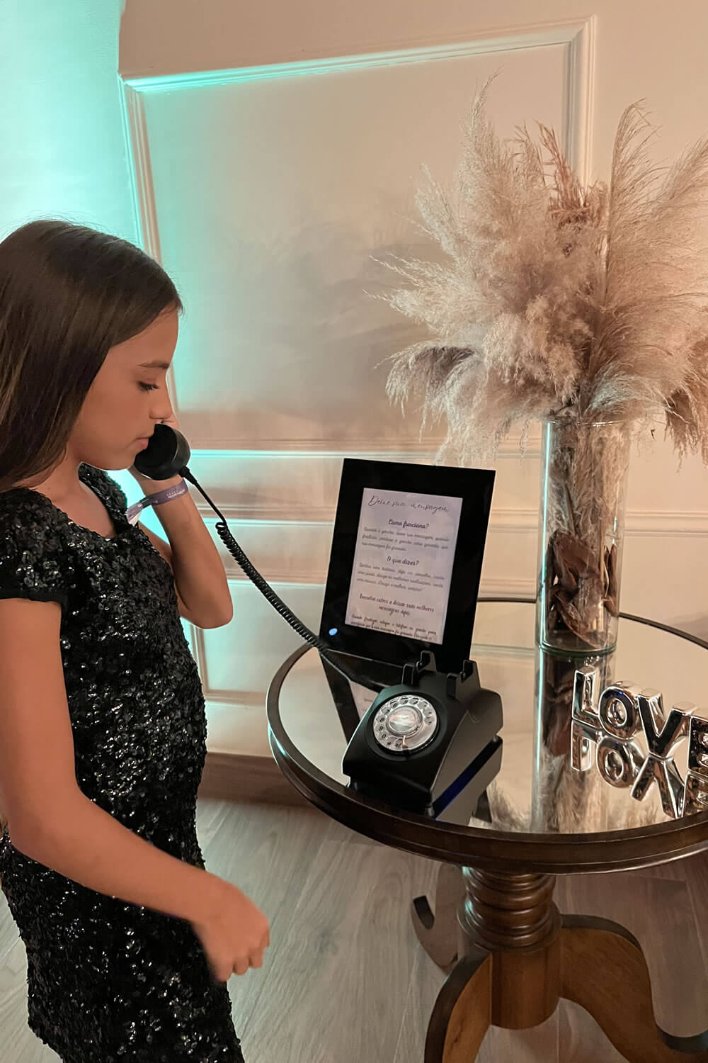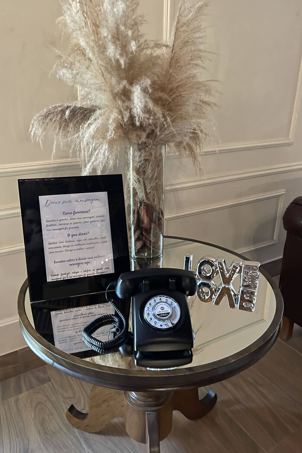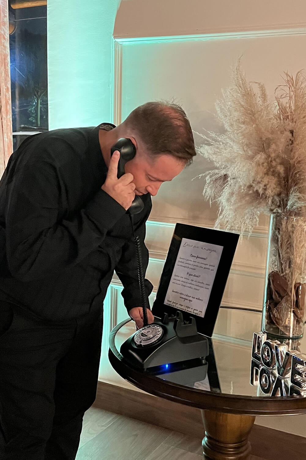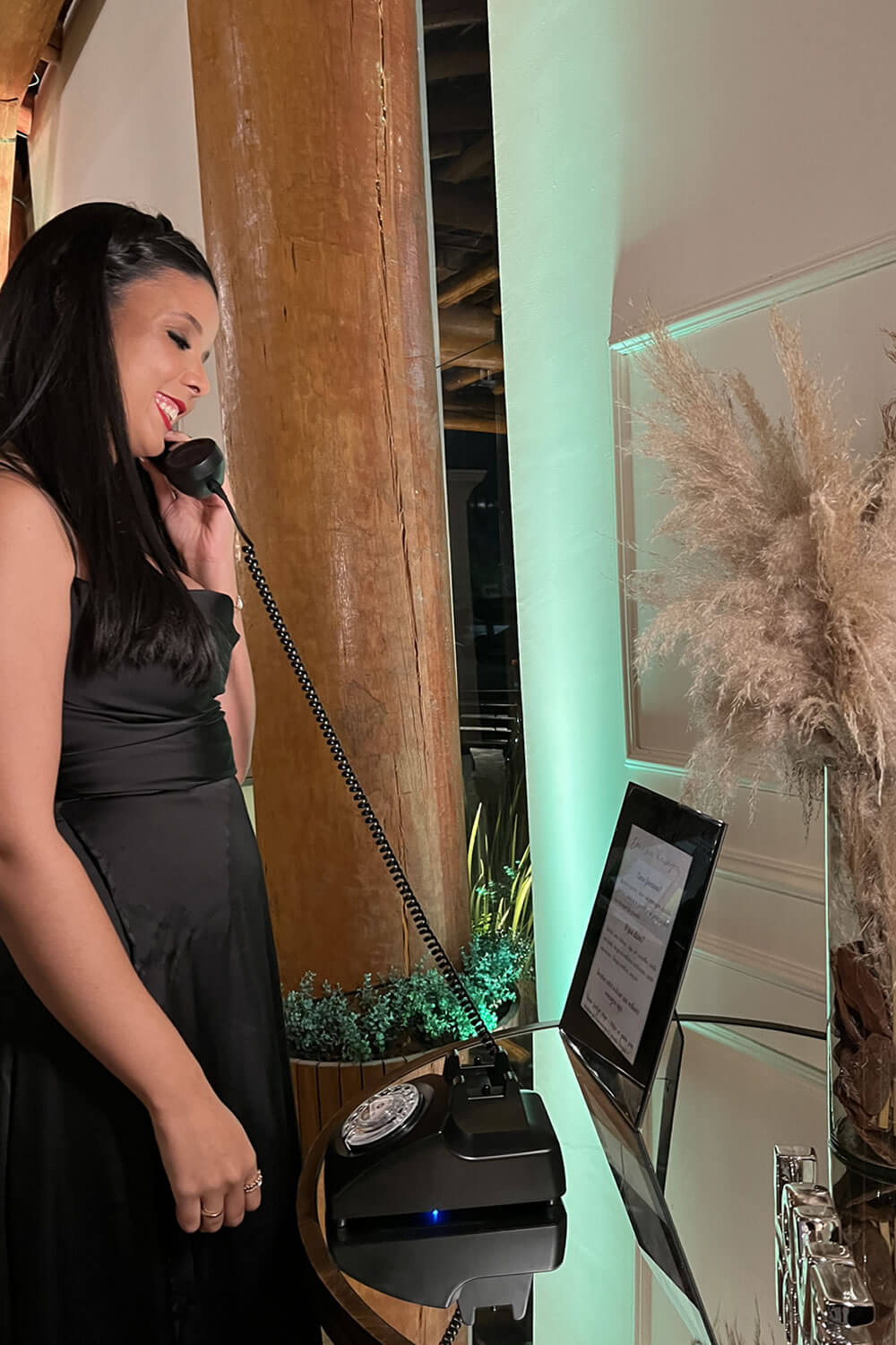 Nosso novo produto “Áudio Memories” funciona exatamente como um telefone retrô. Os convidados vão tirar o telefone do gancho e vão ouvir uma mensagem gravada pelos anfitriões da festa. Após o sinal, devem gravar uma mensagem sincera do fundo do coração que ecoará pela eternidade.